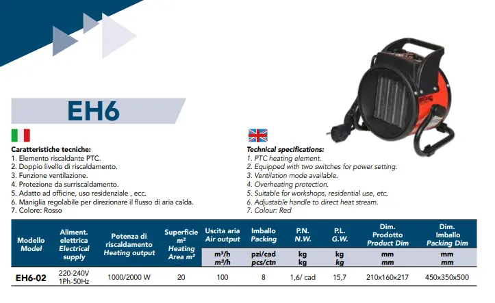 Dati Tecnici Alimentazione 230V Potenza Nominale 3000 W Portata Aria 150 m³/h Superficie Riscaldata 35 m² Colore Rosso Dimensioni 21 x 26 x 29 cm Peso 2,9 Kg